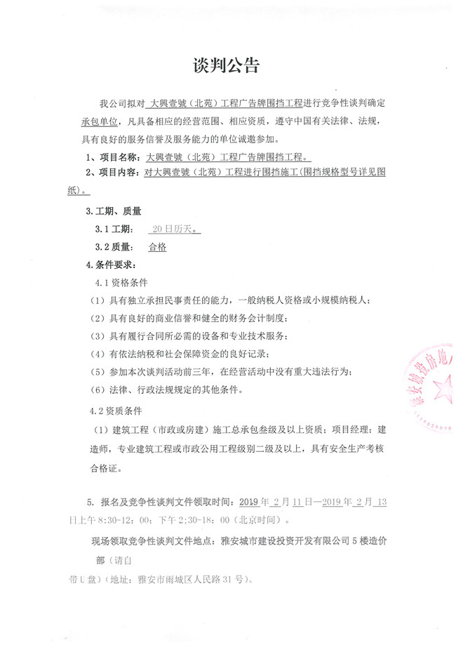 大興壹號(北苑)工程廣告牌圍擋工程競爭性談判公告
