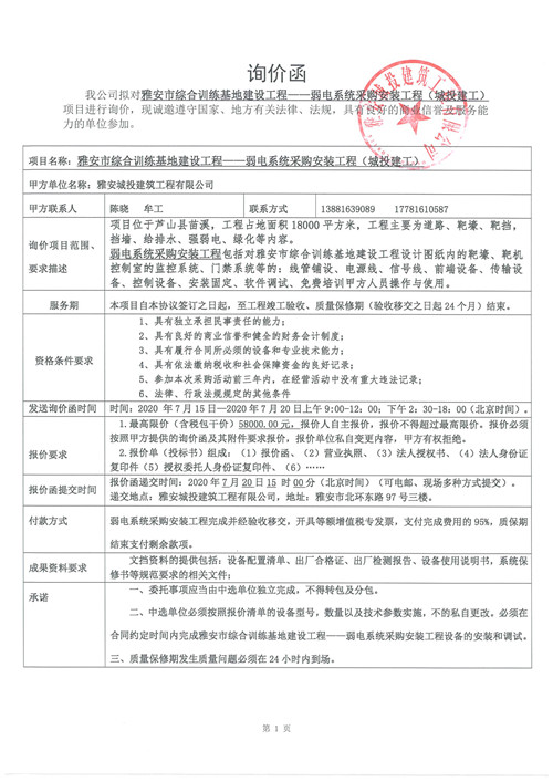 城投建工公司雅安市綜合訓練基地建設工程——弱電系統采購安裝工程詢價函