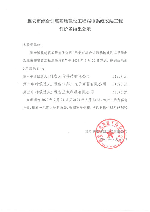 雅安市綜合訓練基地建設工程弱電系統安裝工程詢價函結果公示