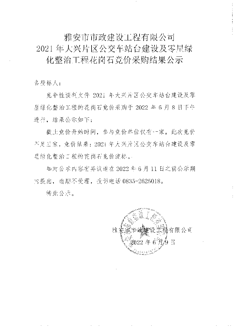 2021年大興片區公交站臺建設及零星綠地整治工程花崗石競價采購結果公示