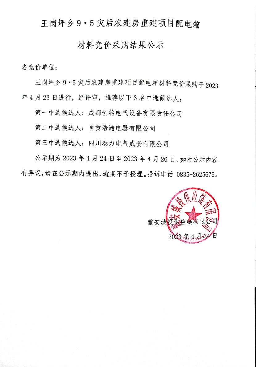 王崗坪鄉9·5災后農建房重建項目配電箱材料競價采購結果公示
