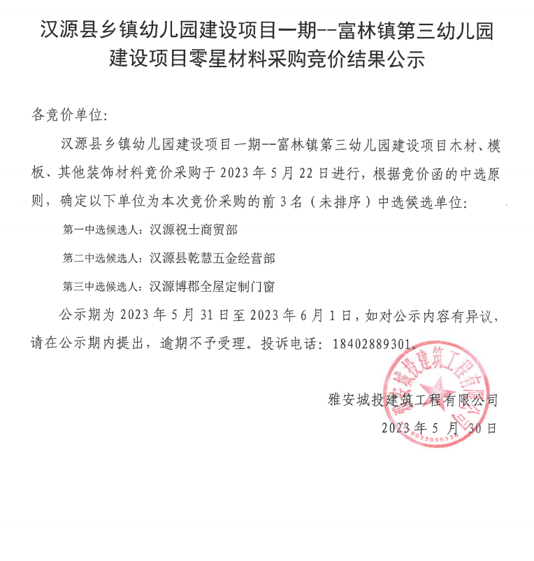 漢源縣鄉鎮幼兒園建設項目一期--富林鎮第三幼兒園建設項目零星材料采購競價結果公示