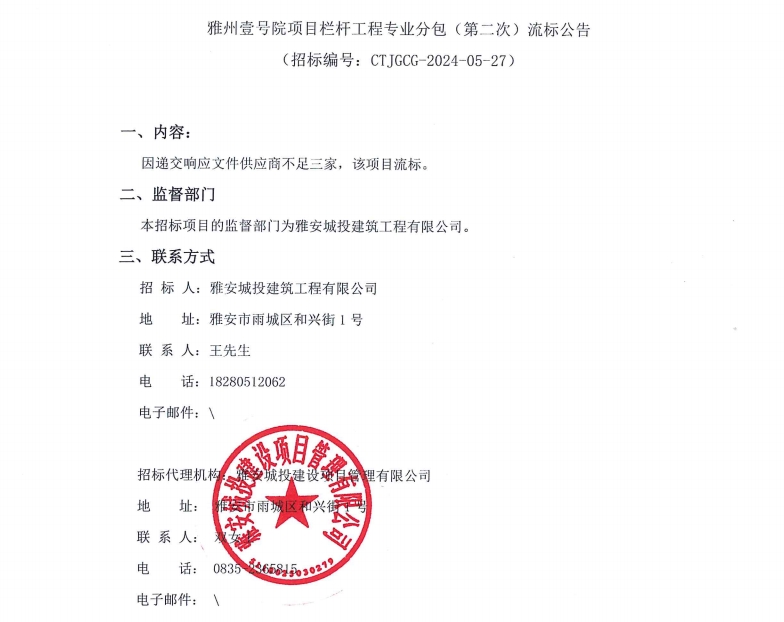 雅州壹號院項目欄桿工程專業分包(第二次)流標公告