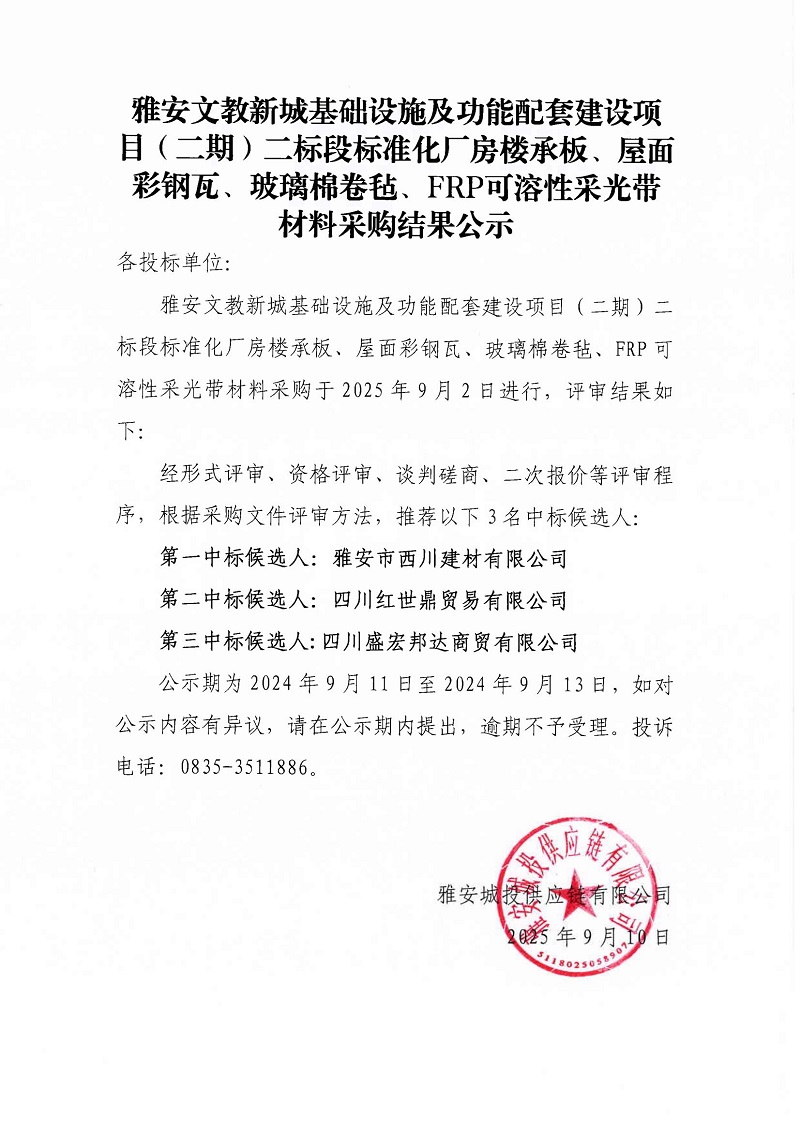 雅安文教新城基礎設施及功能配套建設項目(二期)二標段標準化廠房樓承板、屋面彩鋼瓦、玻璃棉卷氈、FRP可溶性采光帶材料采購結果公示