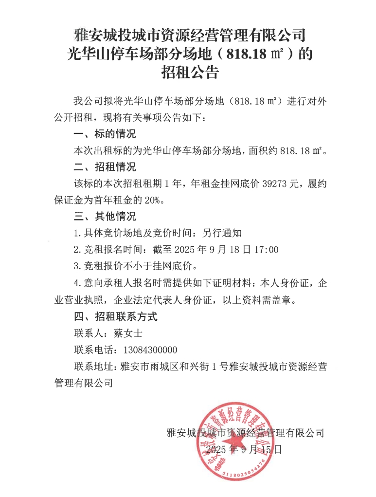 雅安城投城市資源經營管理有限公司光華山停車場部分場地(818.18㎡)的招租公告